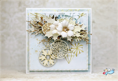 Ciekawy kształt pudełka, które pomieści drobny upominek, w połączeniu z papierami scrapowymi nabiera wyjątkowego uroku. Do ozdobienia pudełka wybrałam papiery kolekcji Błysk Nadziei. Delikatne, subtelne odcienie błękitu i złota, które podbiłam tradycyjną, świąteczną czerwienią.